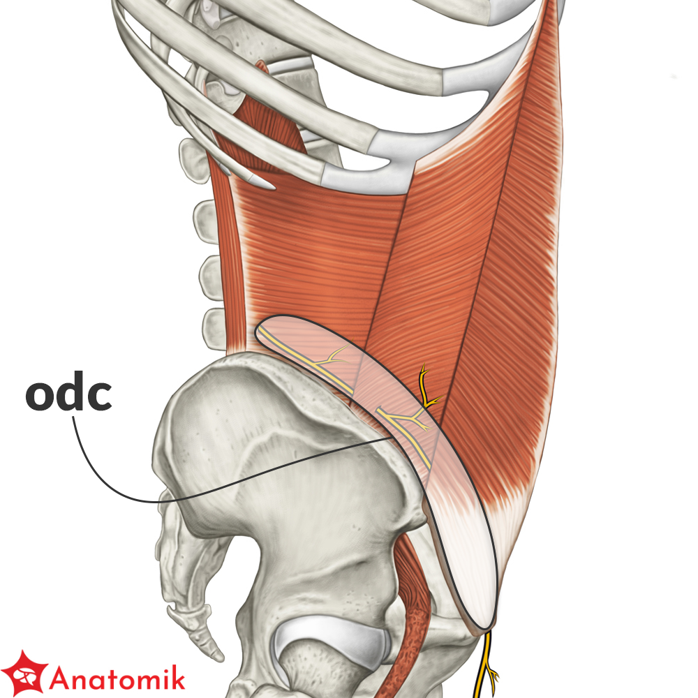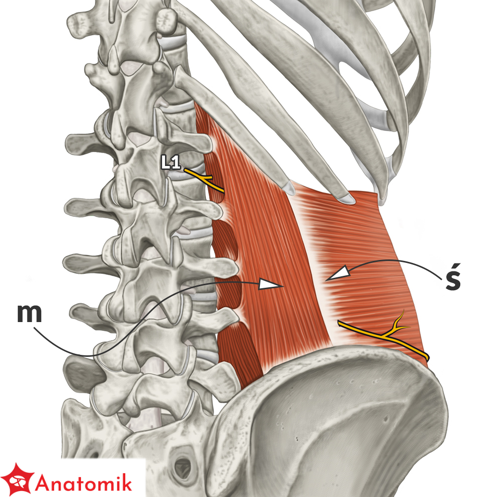 Po przebiciu ścięgna lub brzuśca mięśnia poprzecznego brzucha biegnie pomiędzy nim a mięśniem skośnym wew. brzucha.