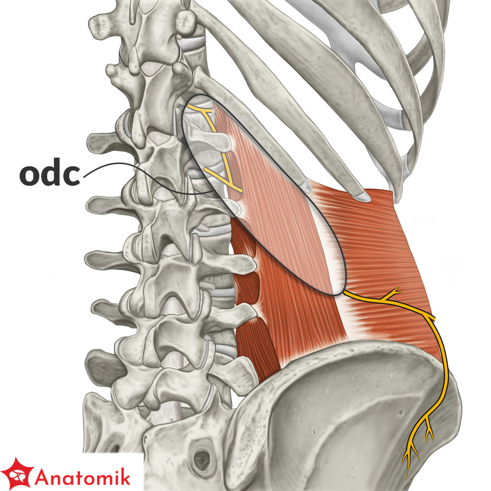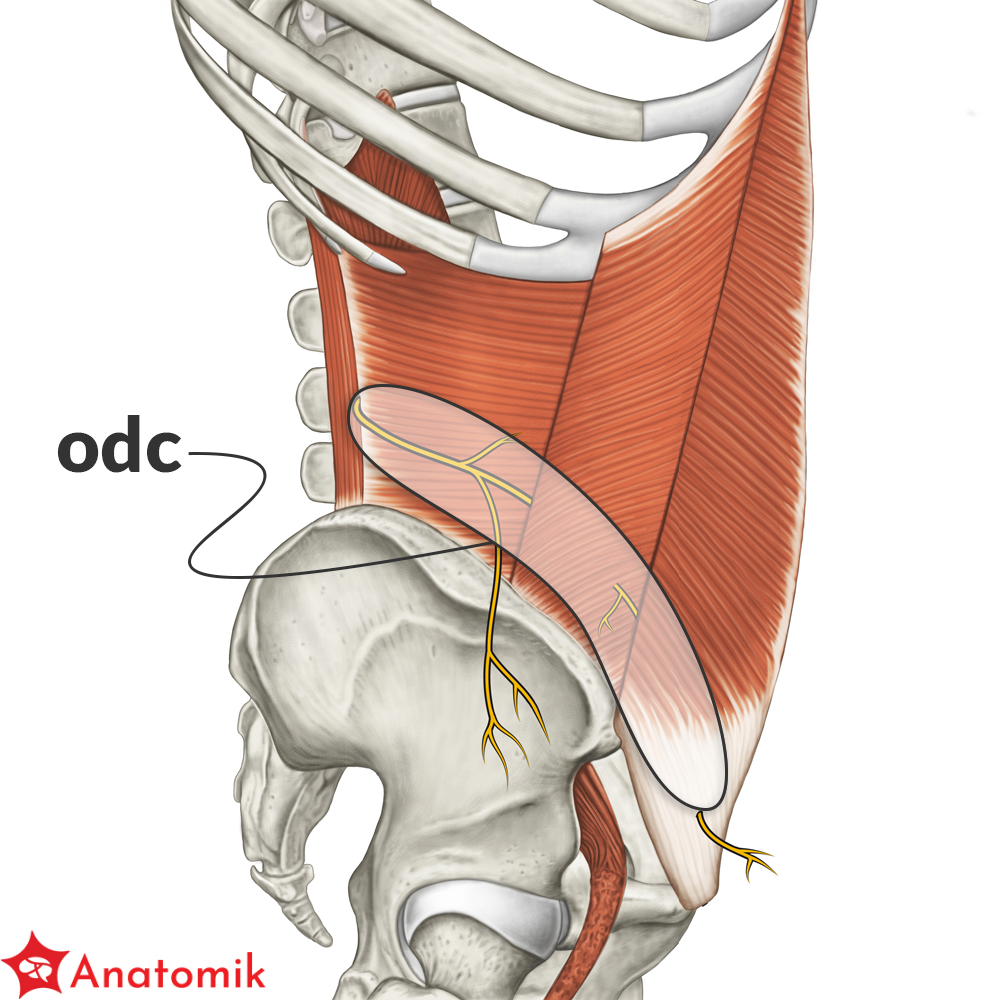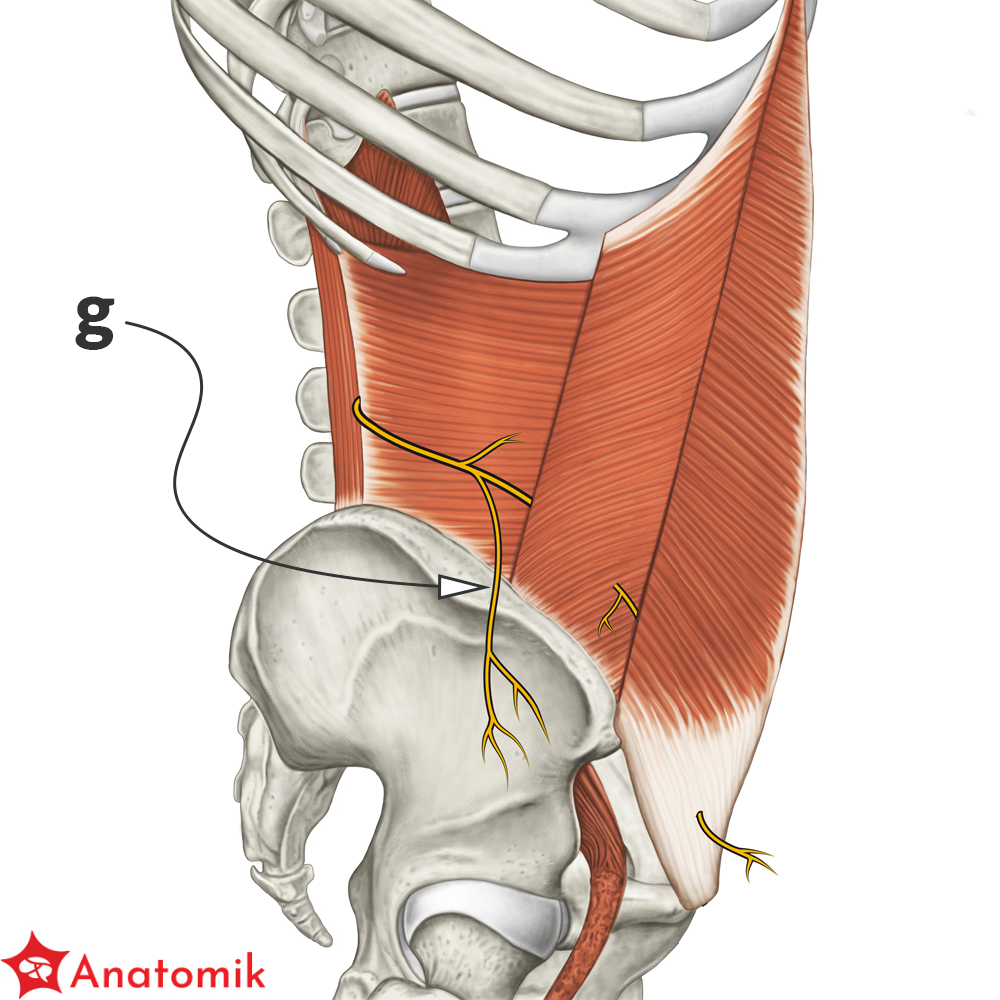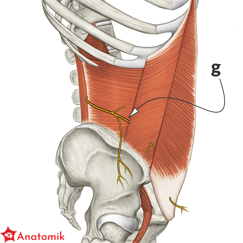 Gałęzie mięśniowe odchodzą od odcinka międzymięśniowego i biegną do mięśnia poprzecznego oraz obu mięśni skośnych brzucha.