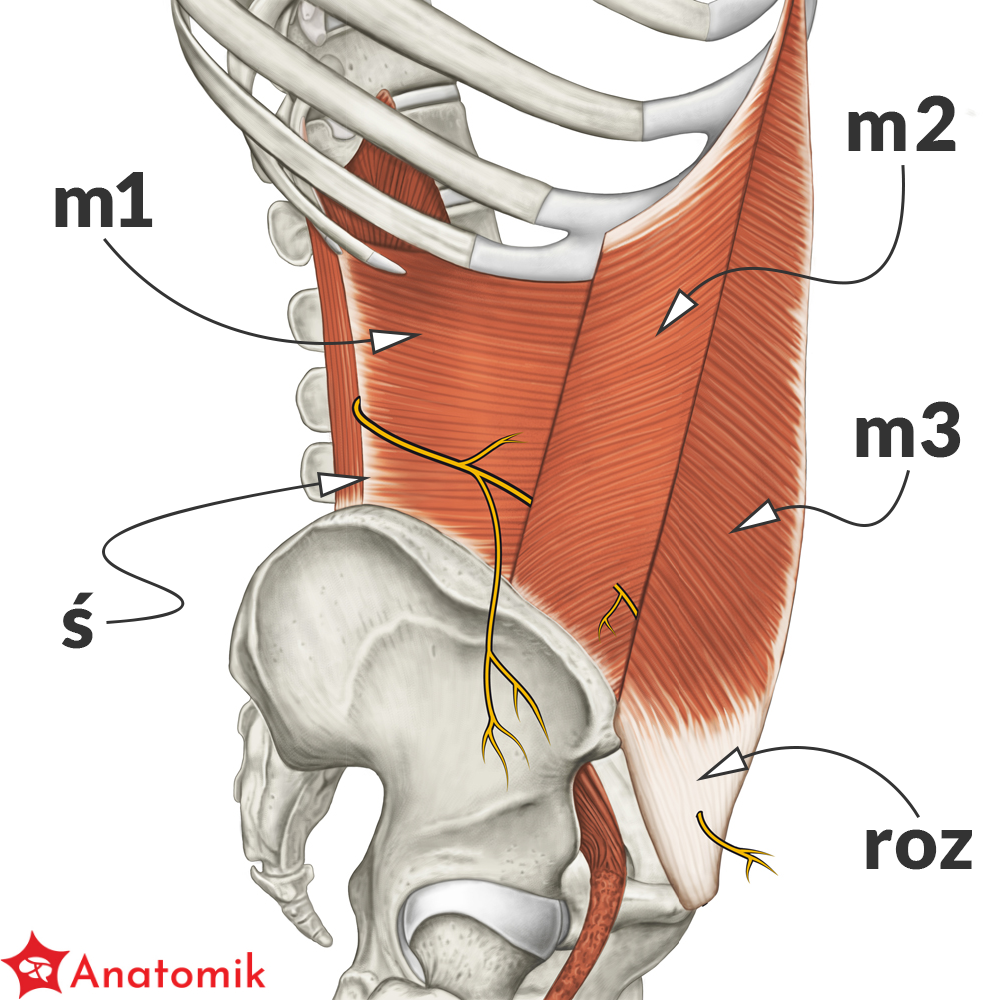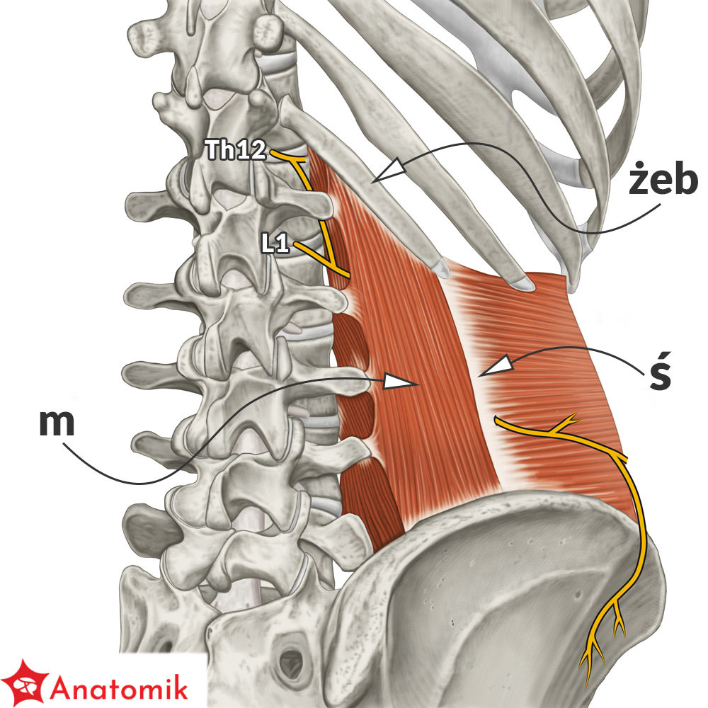 Nerw biodrowo-podbrzuszny odchodzi od korzeni Th12 i L1.
