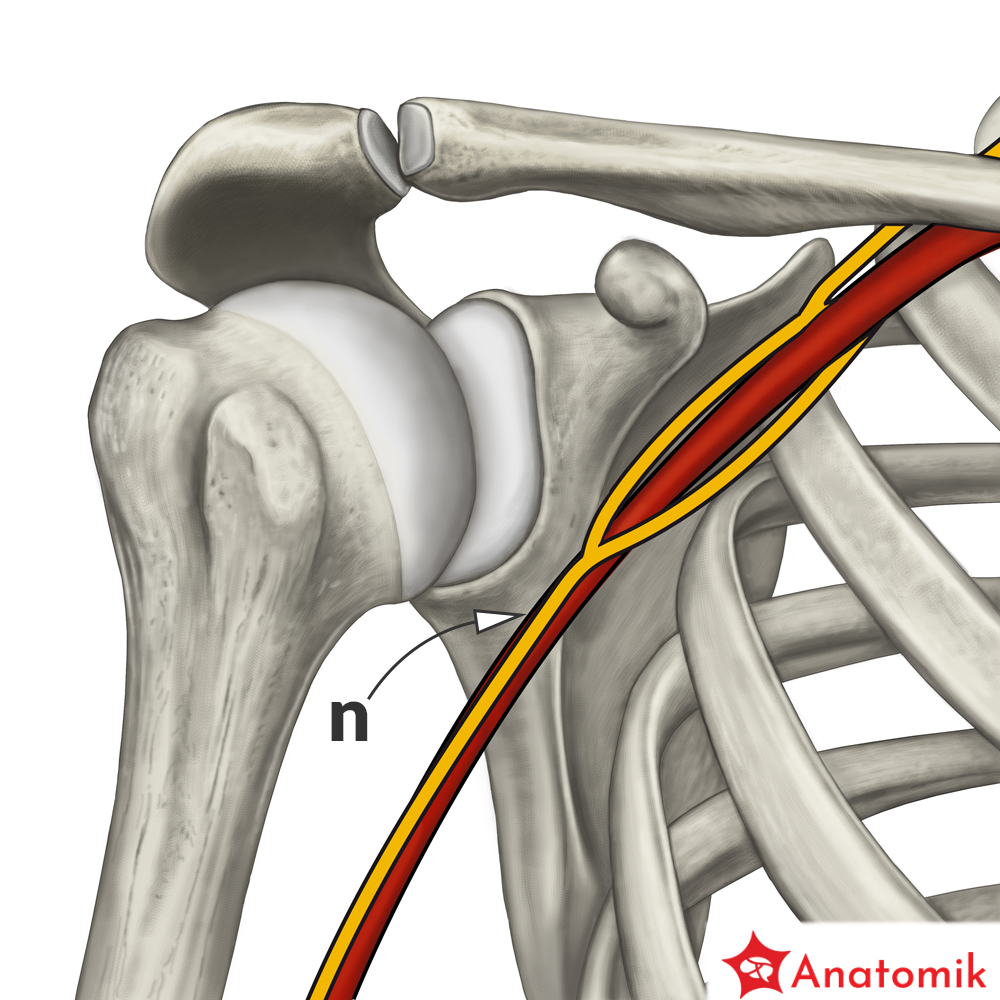 Korzenie nerwu pośrodkowego po odejściu od splotu ramiennego łączą się, tworząc jak gdyby widełki, obejmujące od przodu tętnicę pachową mniej więcej na wysokości dolnego brzegu m. piersiowego mniejszego.