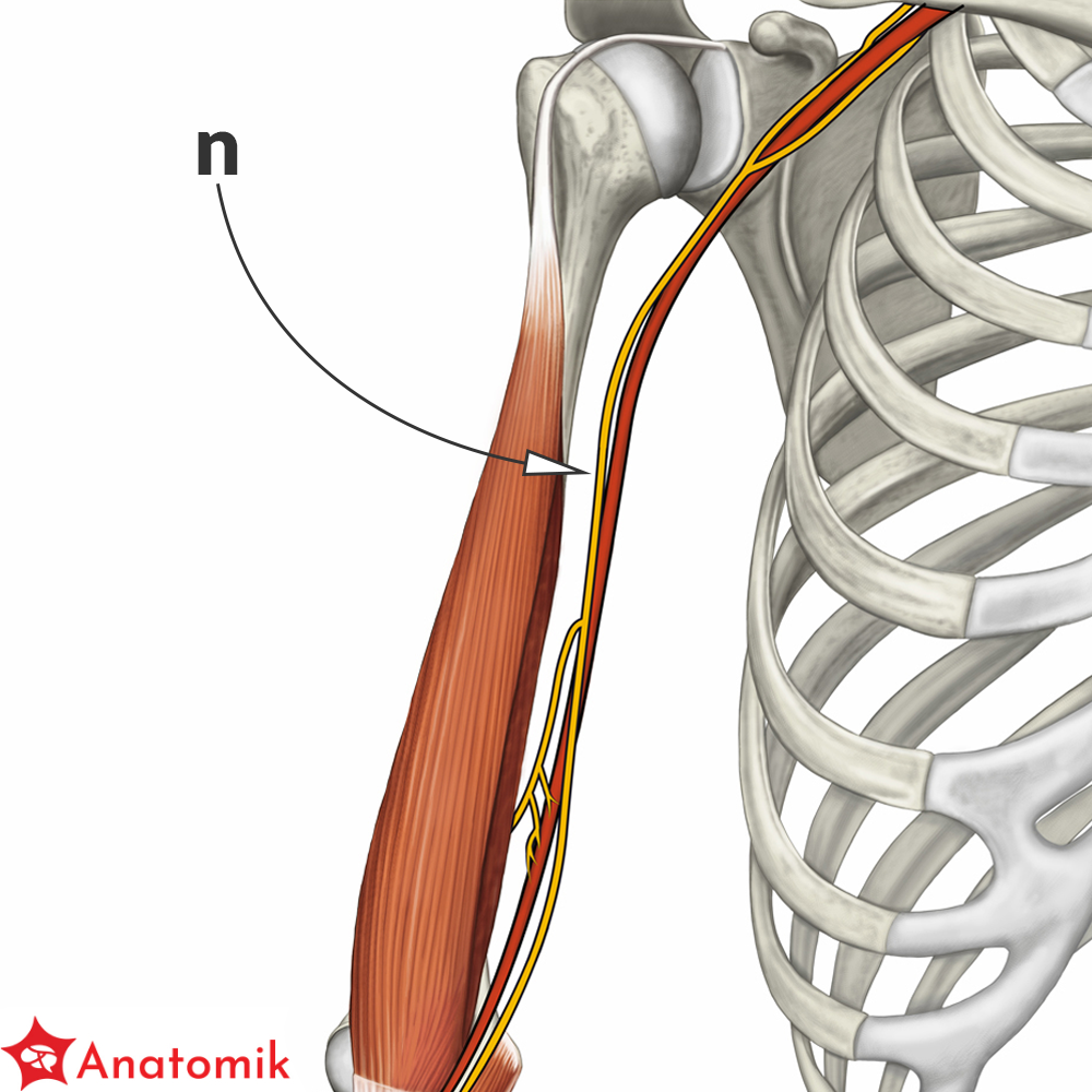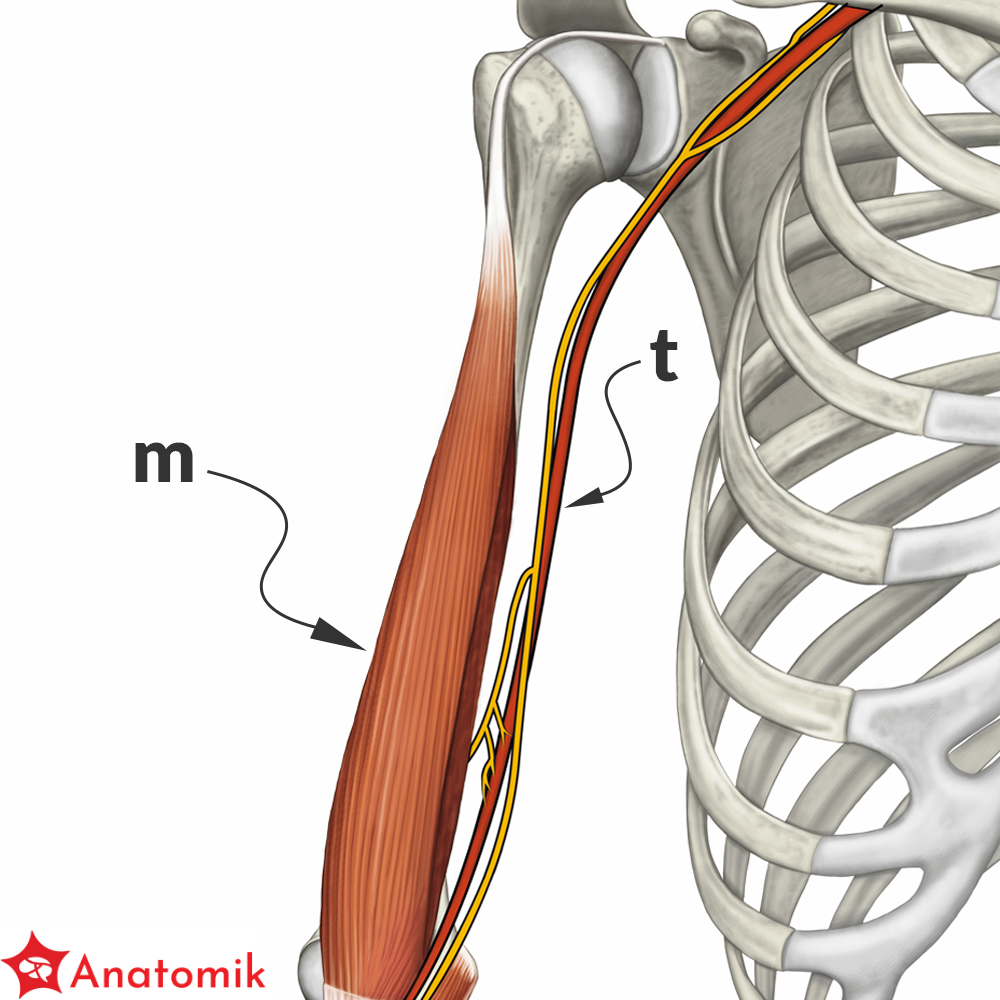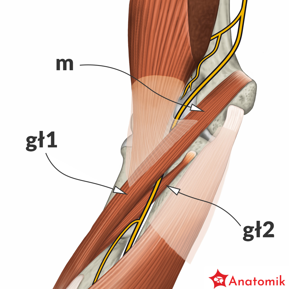 Dalej, wraz z tętnicą ramienną, nerw pośrodkowy wchodzi do dołu łokciowego, przebiegając pod rozcięgnem m. dwugłowego ramienia.