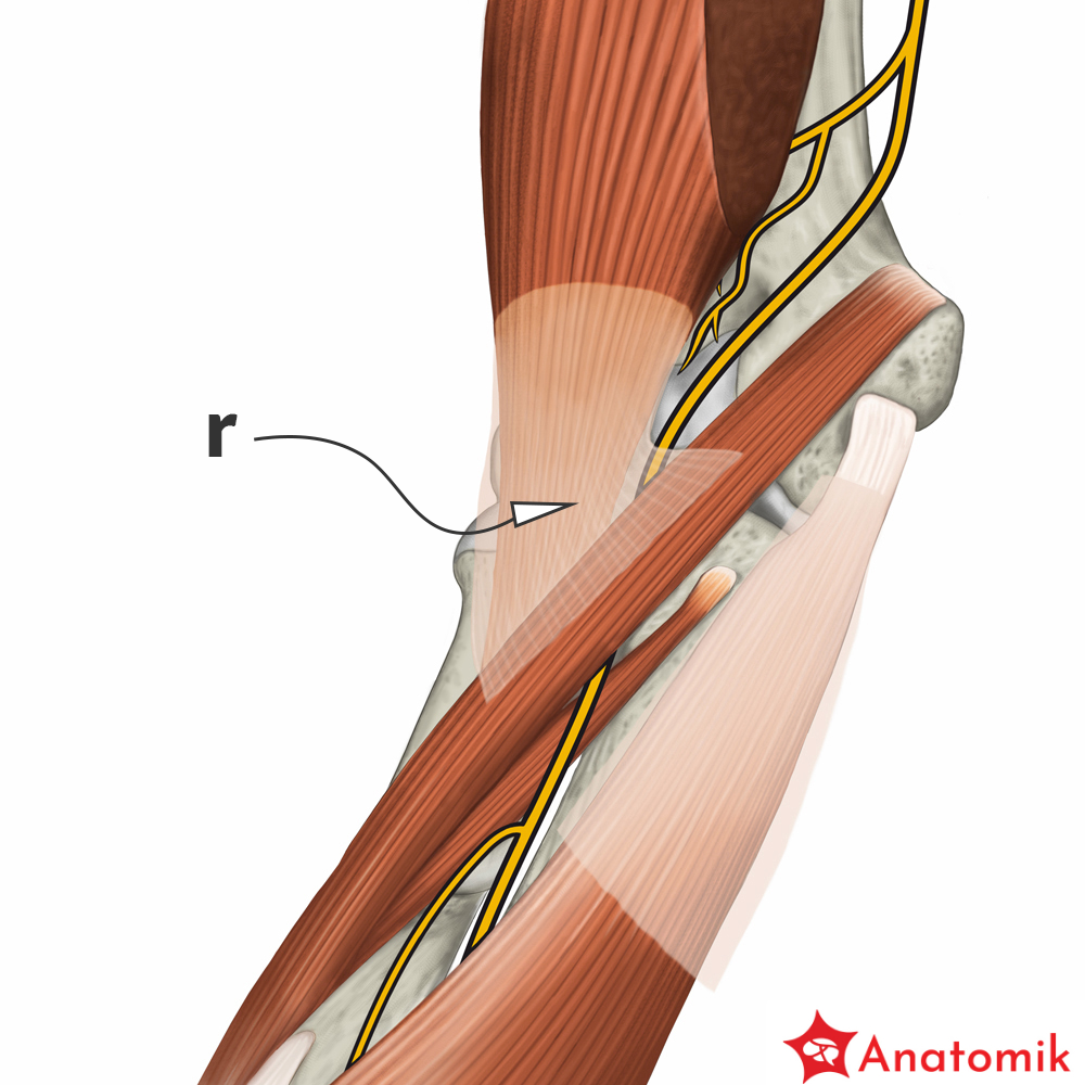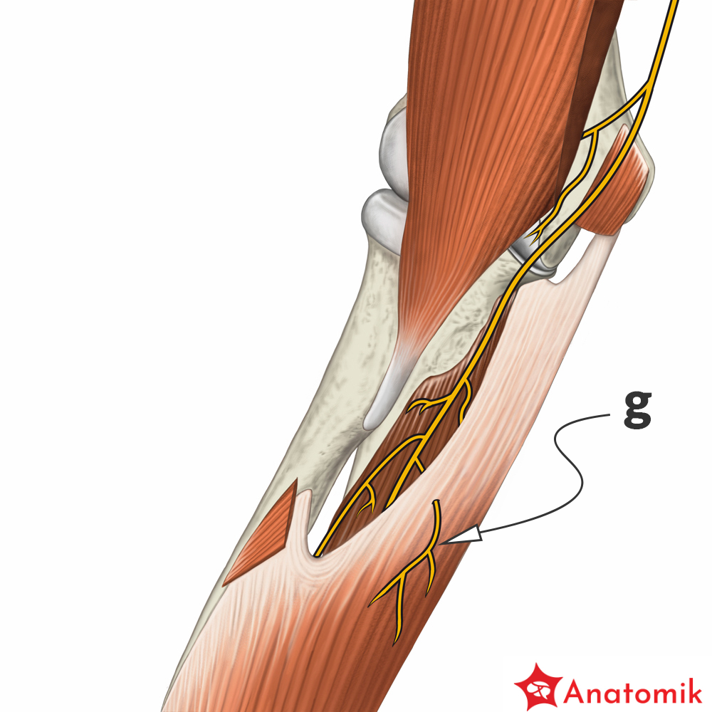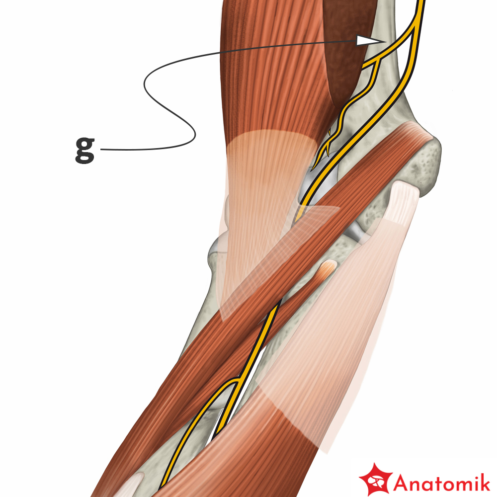 Gałąź do stawu łokciowego odchodzi od nerwu pośrodkowego nieco powyżej zgięcia łokciowego, a następnie kieruje się do stawu łokciowego unerwiając jego przednią ścianę.