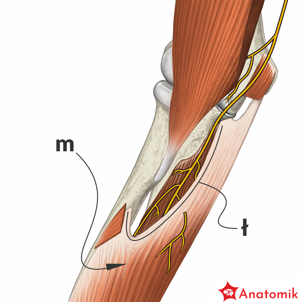 Następnie w górnej części przedramienia przechodzi między dwiema głowami mięśnia nawrotnego obłego, po czym kieruje się w głąb, pod łuk ścięgnisty utworzony przez przyczepy początkowe m. zginacza powierzchownego palców.