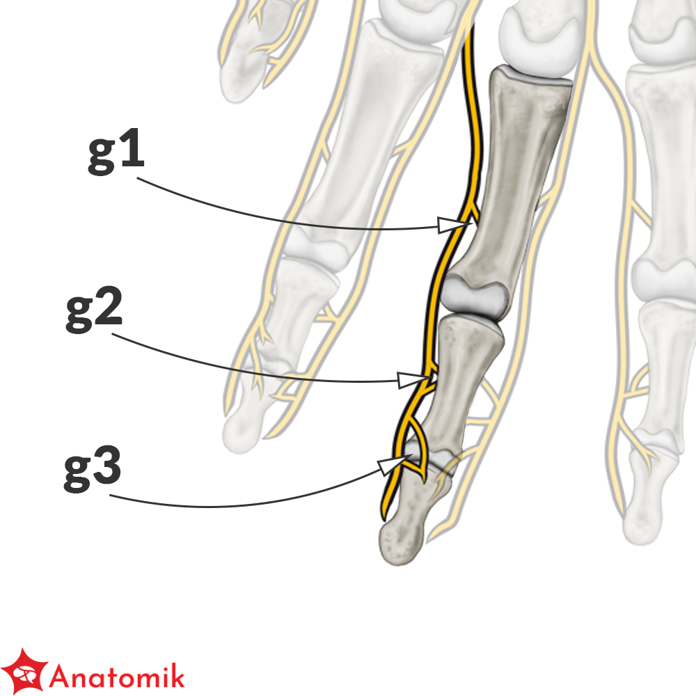 na wysokości paliczka bliższego oddają – gałązkę łączącą (ramus communicans) z odpowiednim n. grzbietowym palca