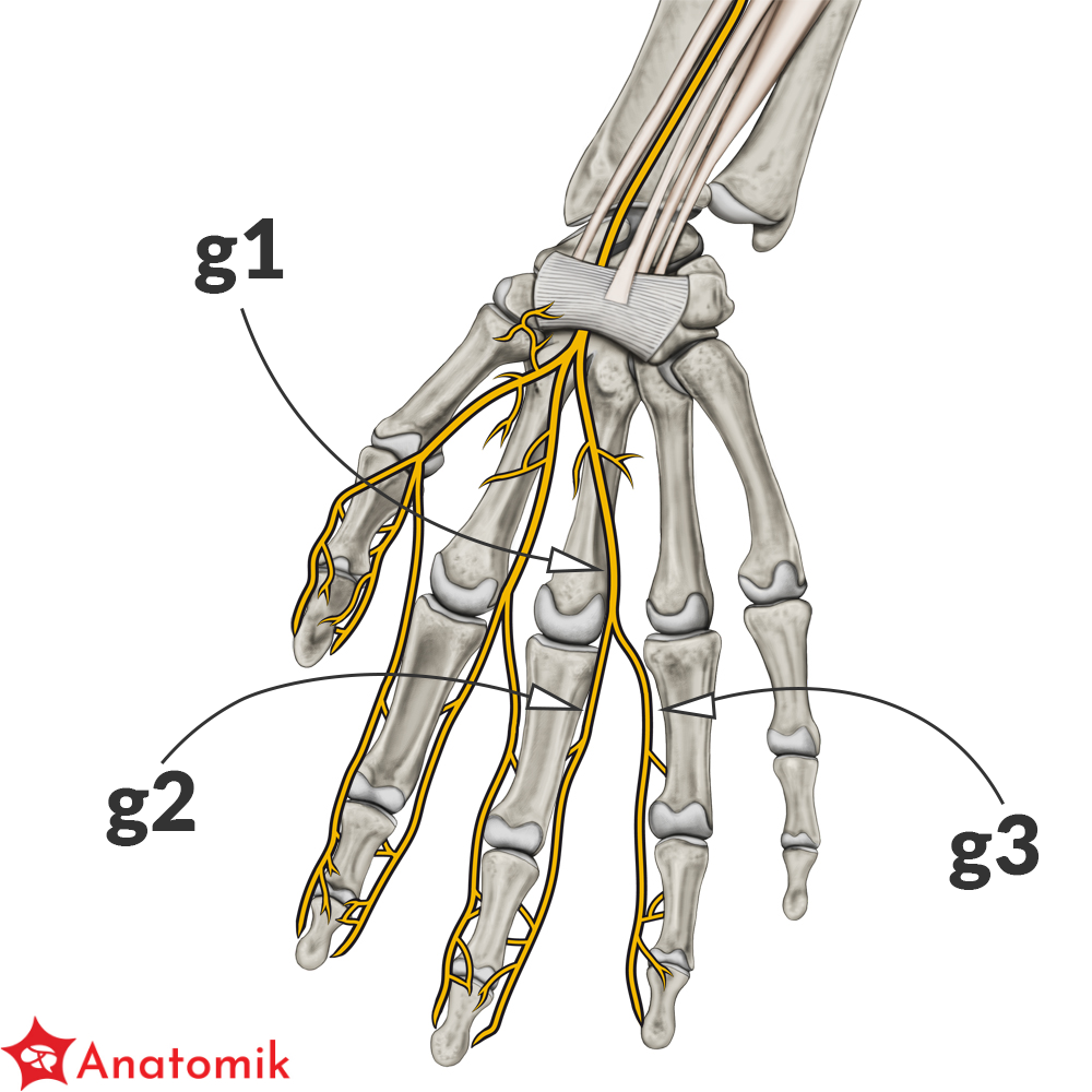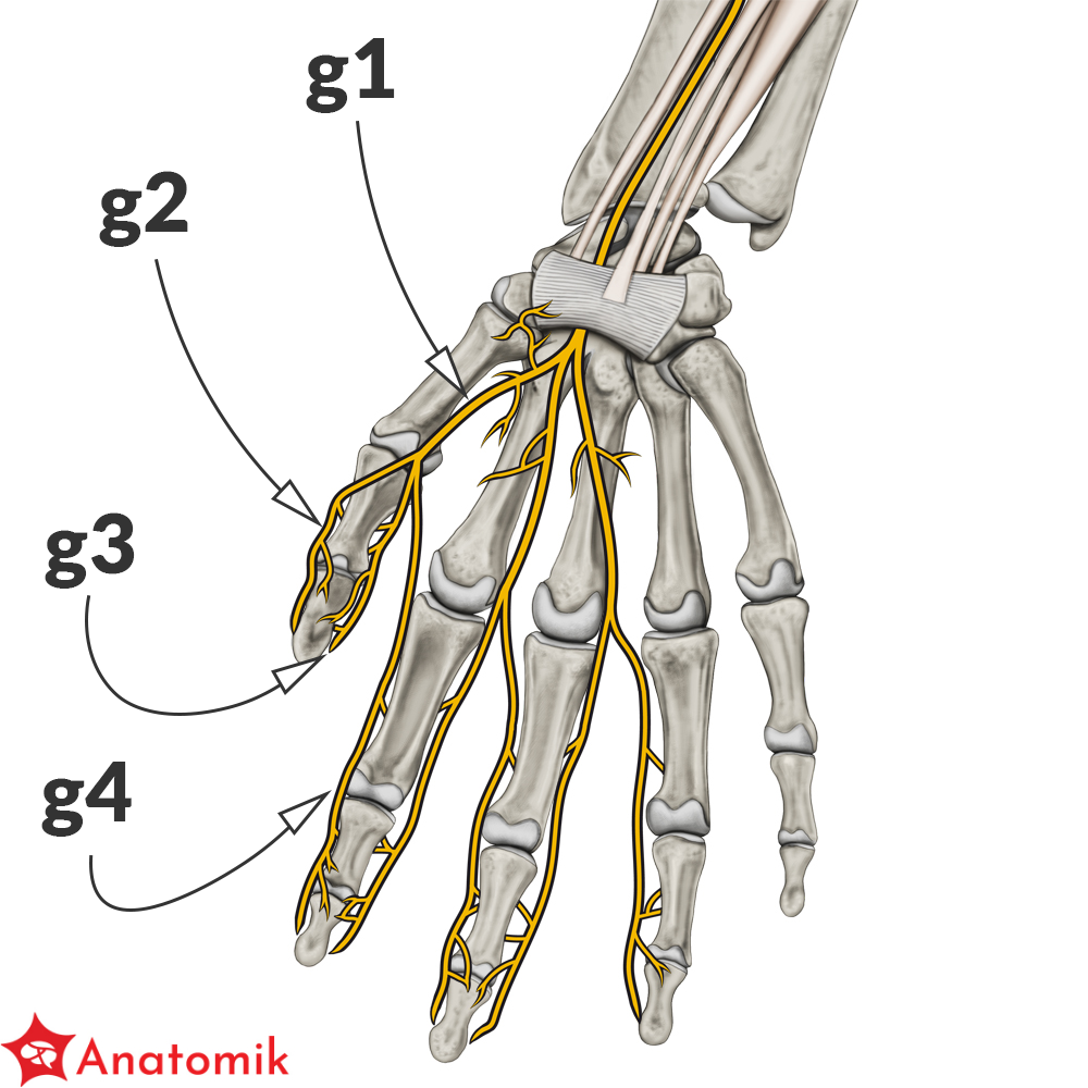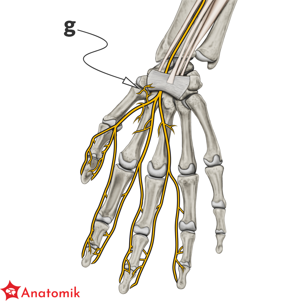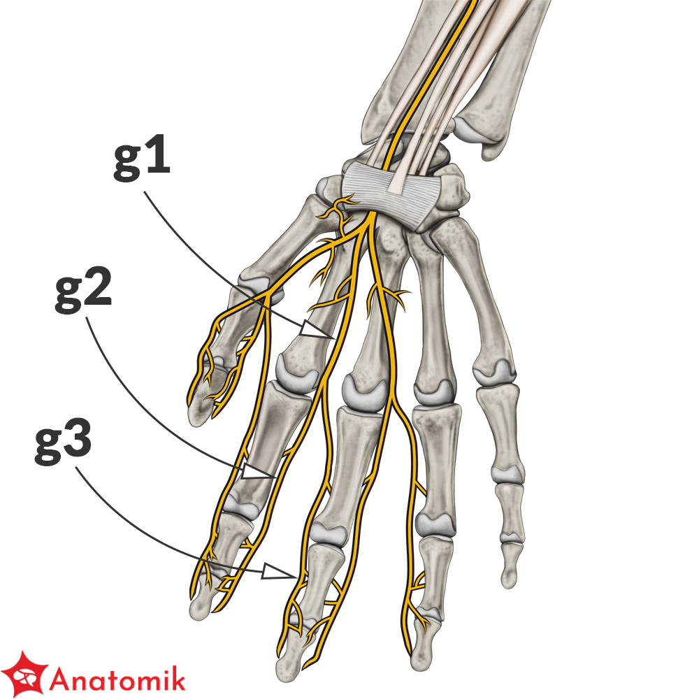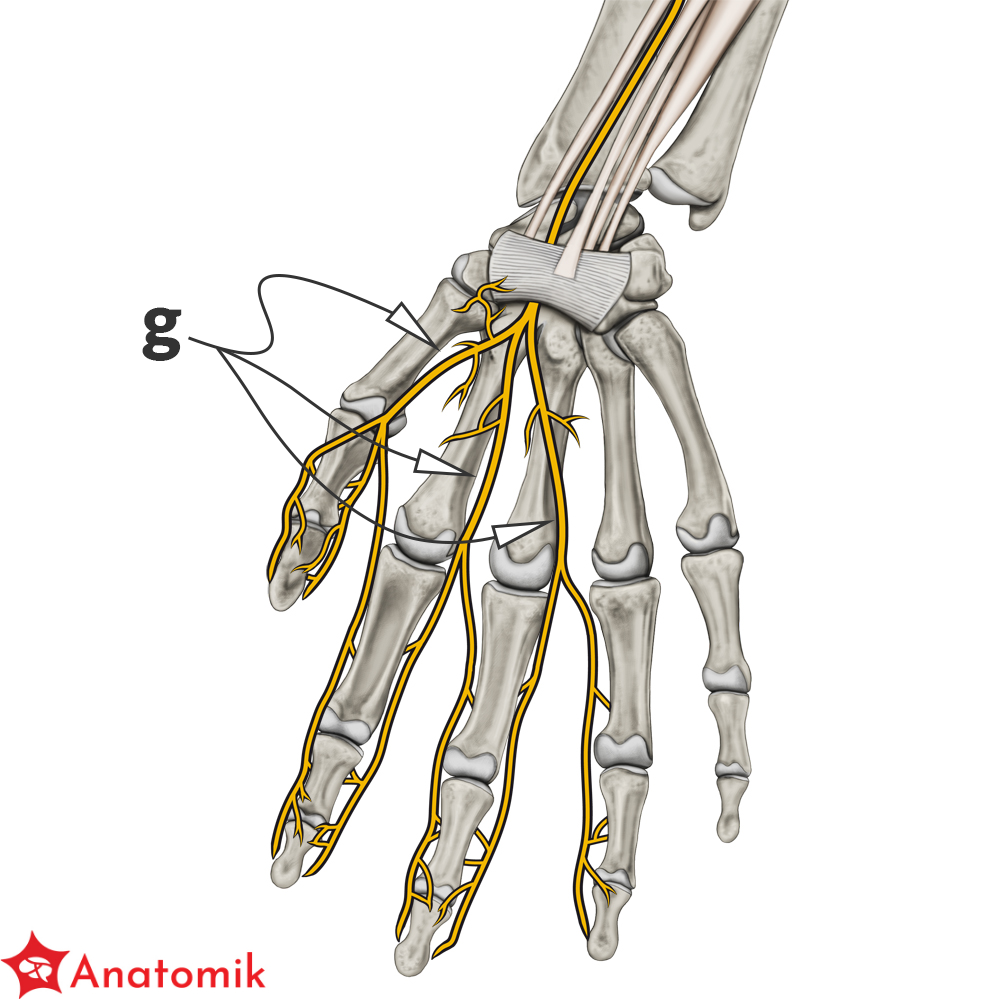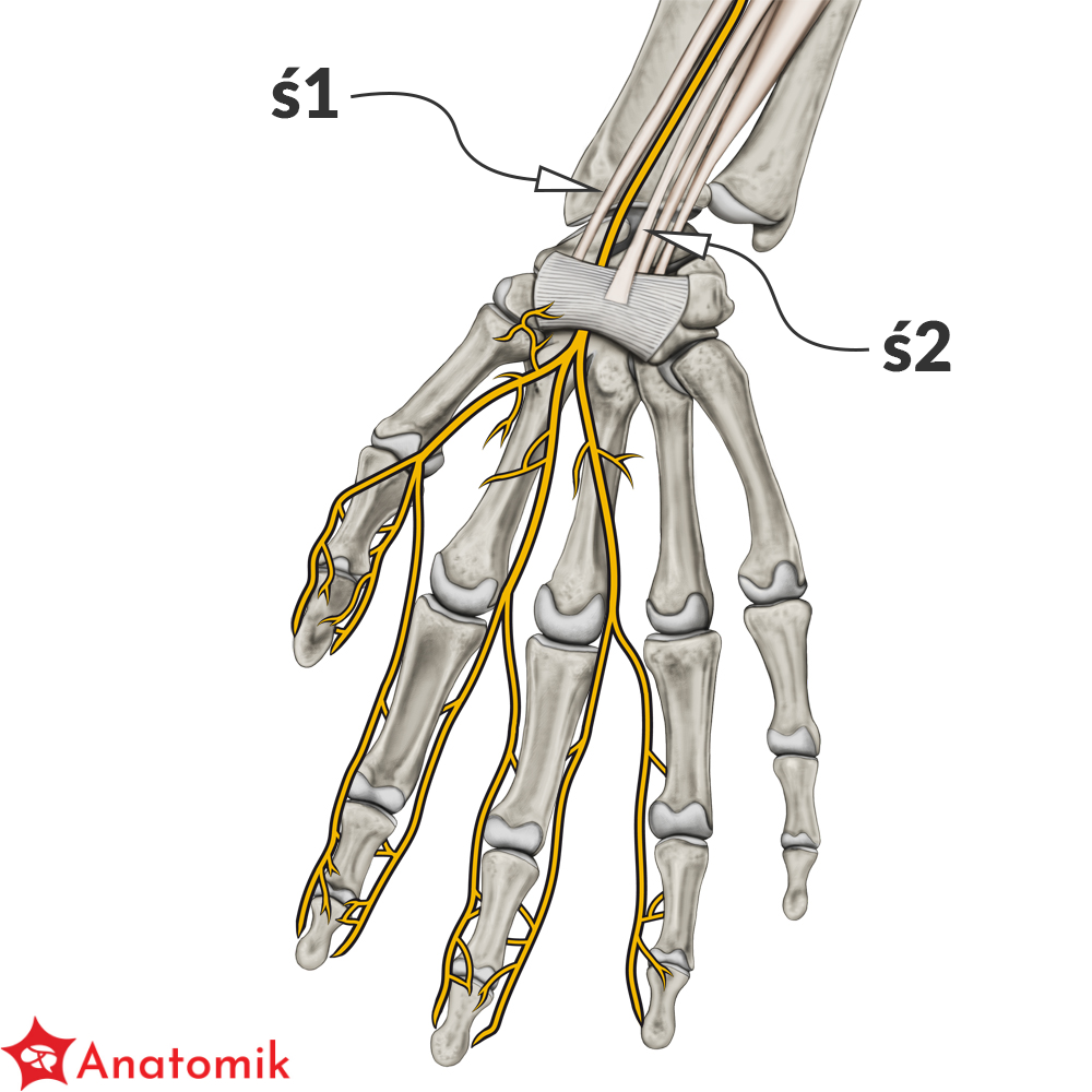Nerwy te biegną równolegle do ścięgien końcowych zginaczy długich palców (zginacz dł. kciuka, zginacz pow. i gł. palców) oddając po drodze gałęzie zaopatrujące skórę dłoni oraz I i II mięsień glistowaty.