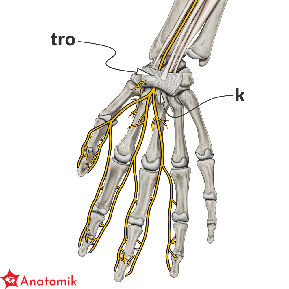 Po wejściu na dłoń, dzieli się na dwie gałęzie końcowe: