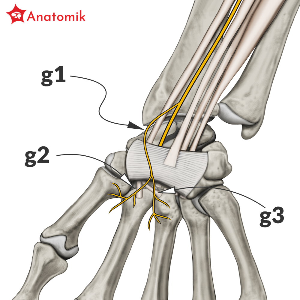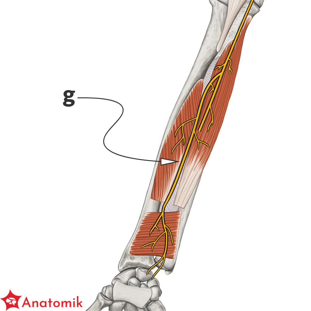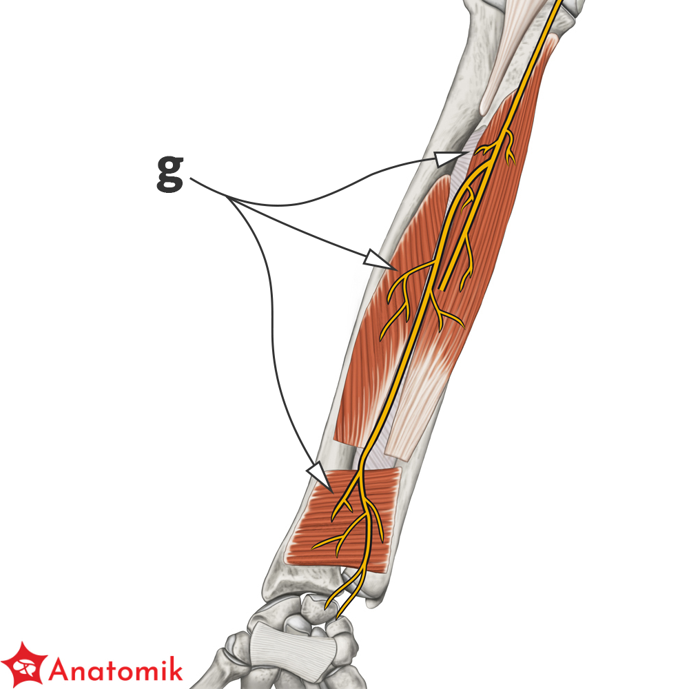 W dolnej części przedramienia nerw ten wnika w m. nawrotny czworoboczny, gdzie oddaje gałęzie końcowe, które przechodzą na przednią powierzchnię stawów nadgarstka.