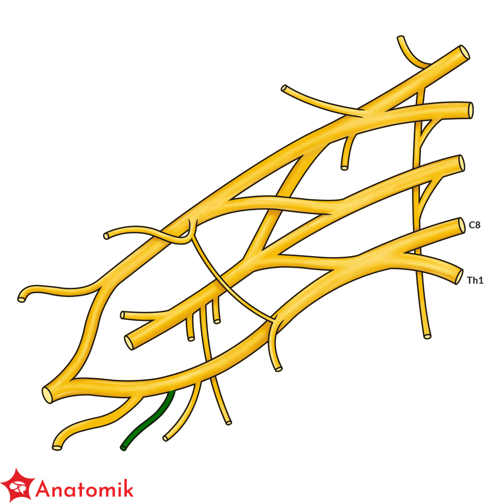 Nerw skórny przyśrodkowy przedramienia odchodzi od pęczka przyśrodkowego splotu ramiennego i zawiera włókna z korzeni C8-Th1.