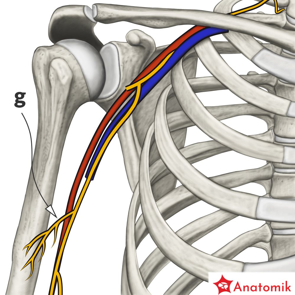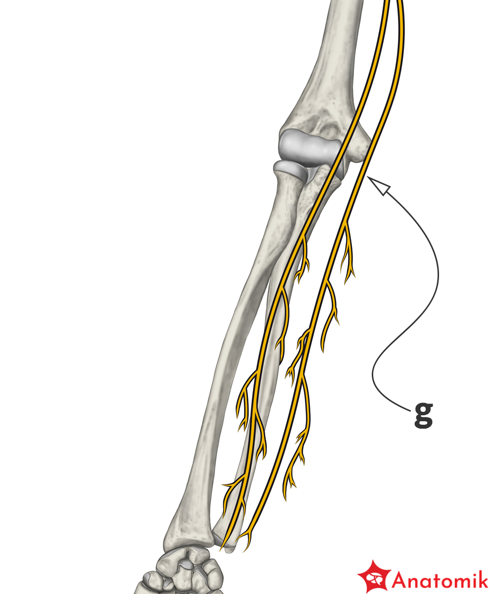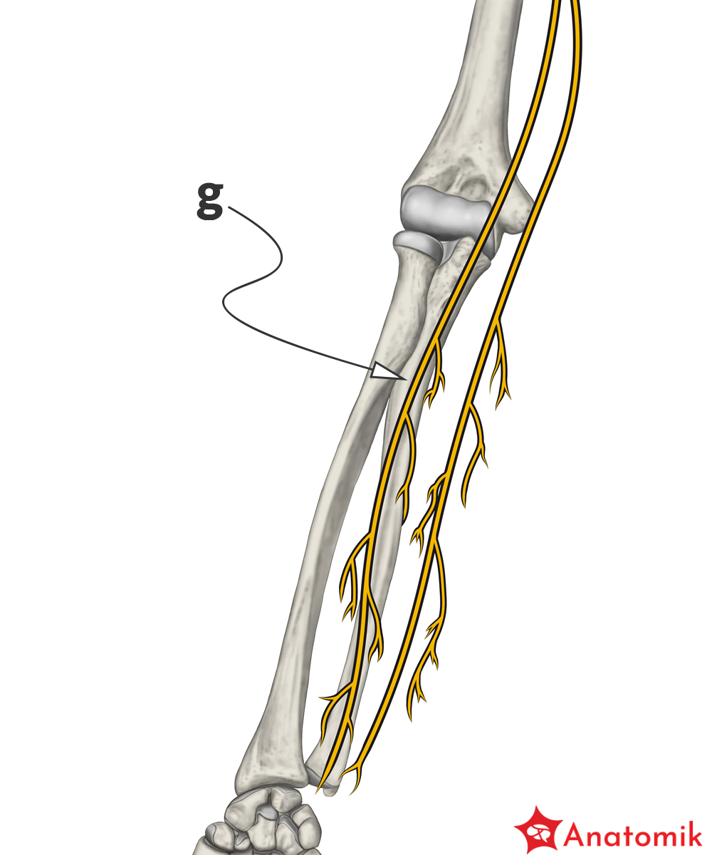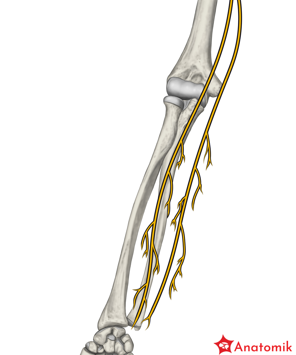 Dalej, mniej więcej w połowie długości ramienia, przebija powięź ramienia i rozdziela się na dwie gałęzie końcowe (przednią i łokciową), które wchodzą na przedramię i kończą się w okolicy ręki.