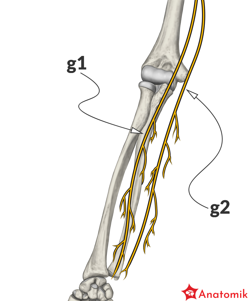 Gałąź przednia stanowi jedną z dwóch gałęzi końcowych nerwu skórnego przyśrodkowego przedramienia. Biegnie ona po przyśrodkowej części powierzchni przedniej przedramienia i zaopatruje skórę tej okolicy.