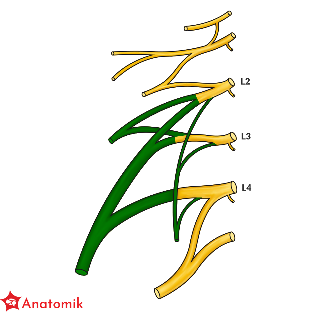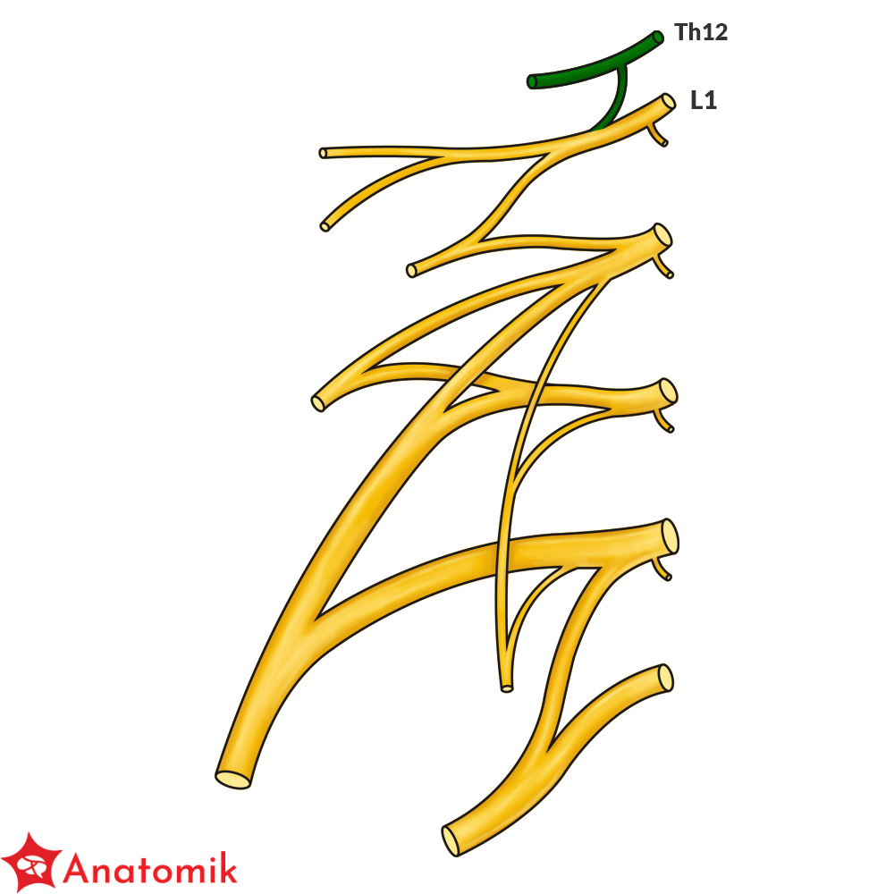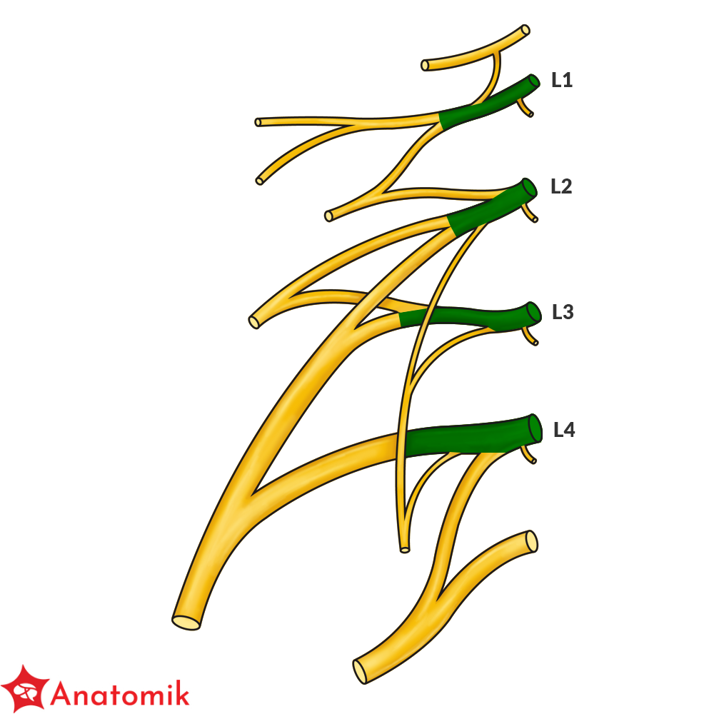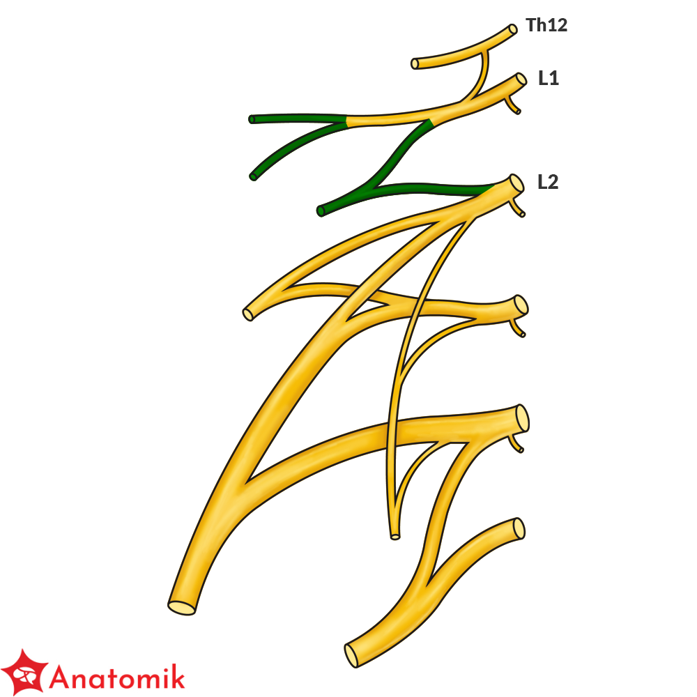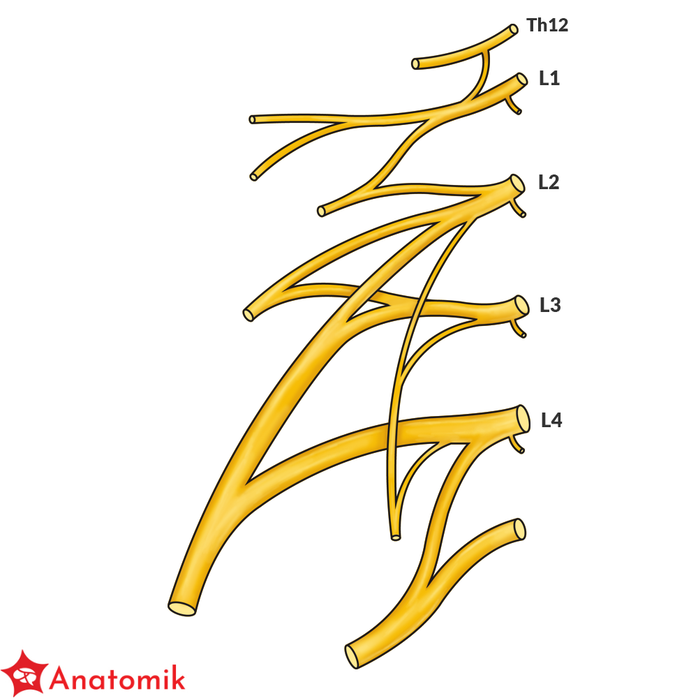 Splot lędźwiowy utworzony jest przez gałęzie przednie nerwów rdzeniowych L1-L4, do których dołączają od góry włókna gałęzi przedniej nerwu rdzeniowego Th12.