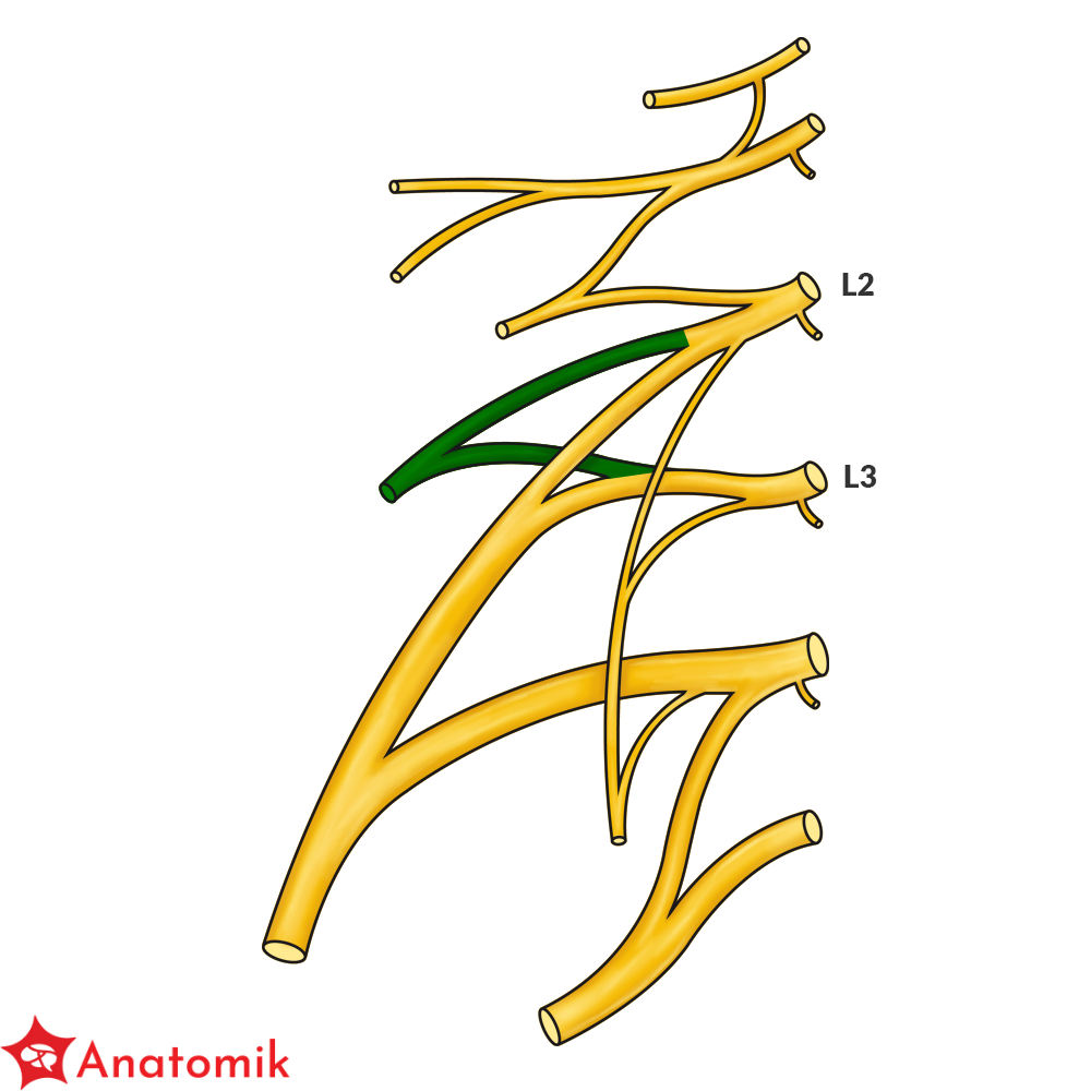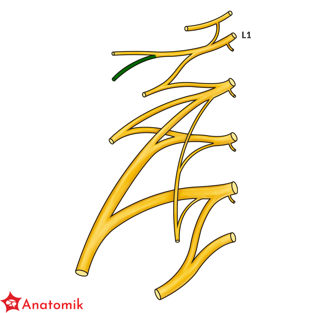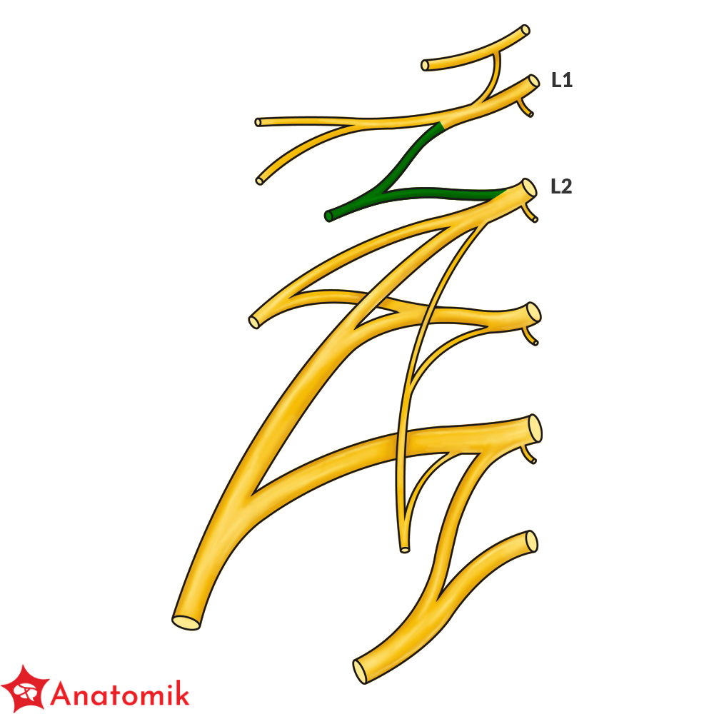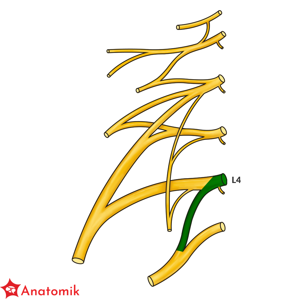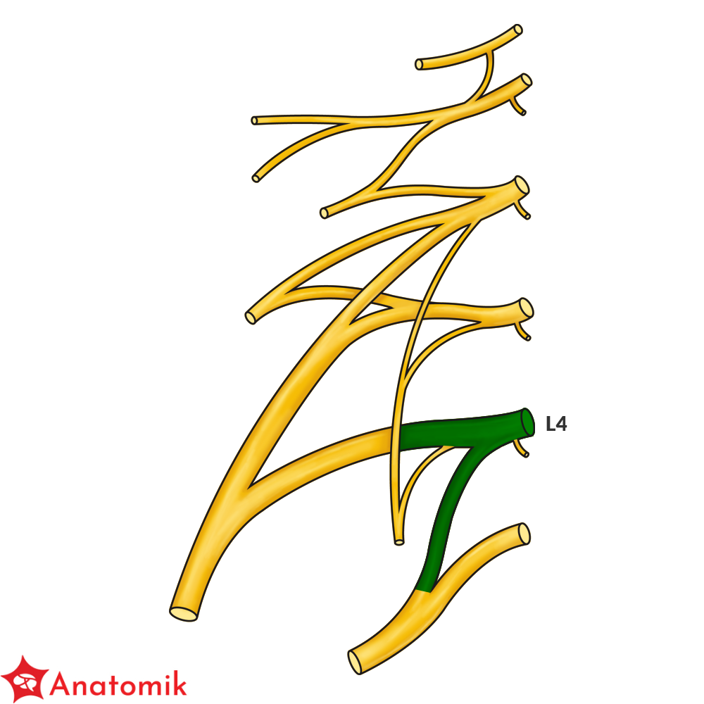 Splot lędźwiowy utworzony jest przez gałęzie przednie nerwów rdzeniowych L1-L4, do których dołączają od góry włókna gałęzi przedniej nerwu rdzeniowego Th12.
